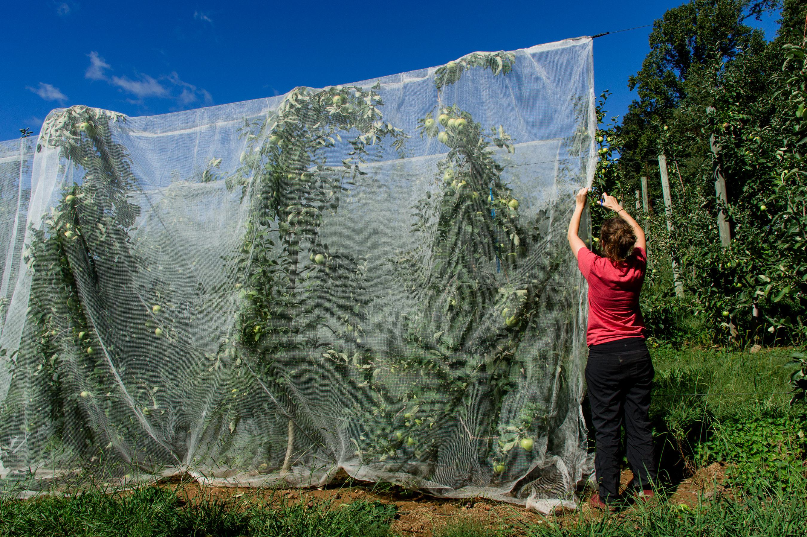Removing protective insect netting to harvest an apple block, Henderson County, 2021