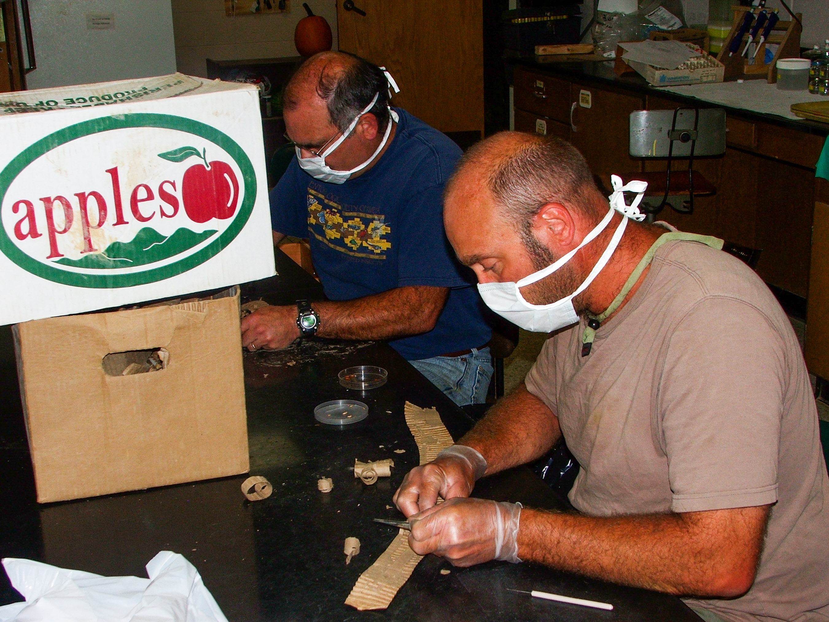 Collecting codling moth pupae from cardboard, MHCREC, 2009