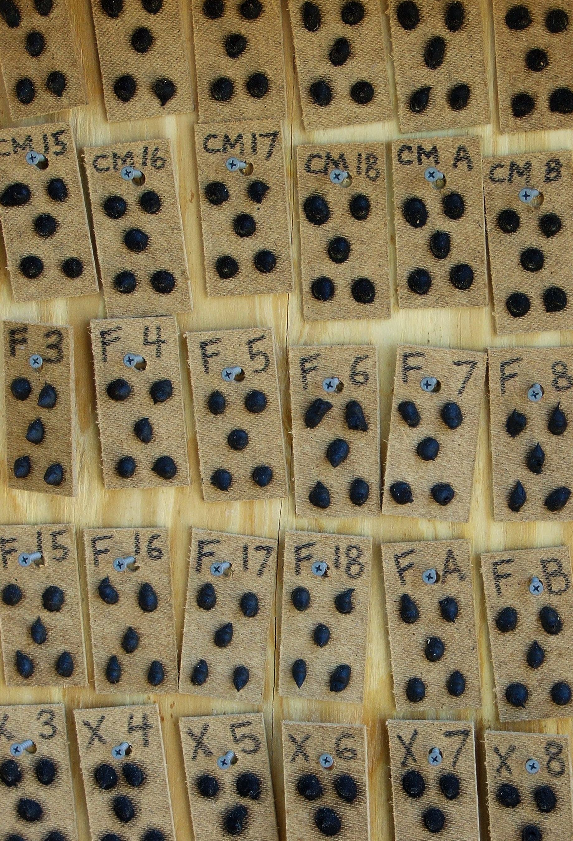 Preparing stink bug sentinel egg masses for parasitism study, MHCREC, 2013