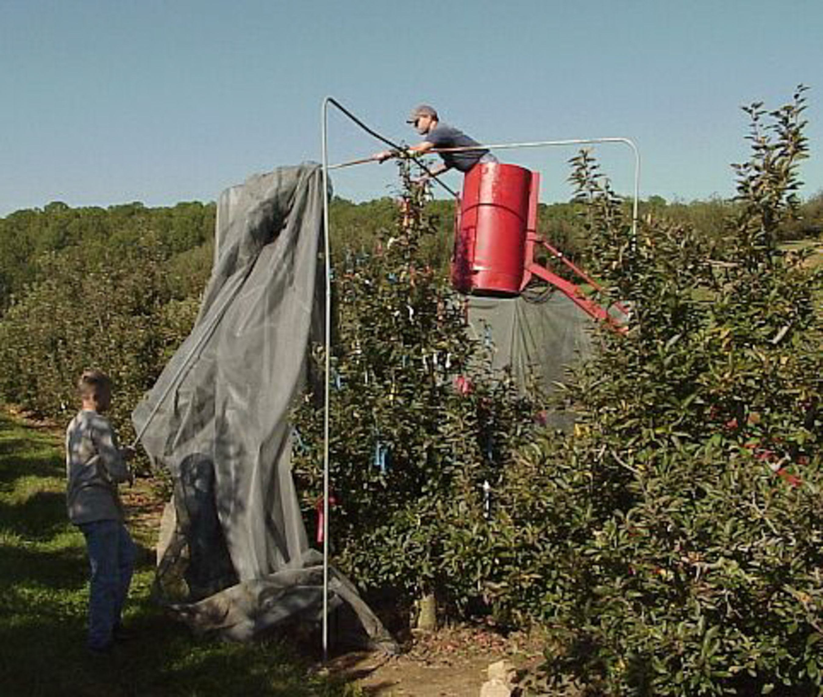 Setting up a codling moth whole-tree oviposition cage, 2001