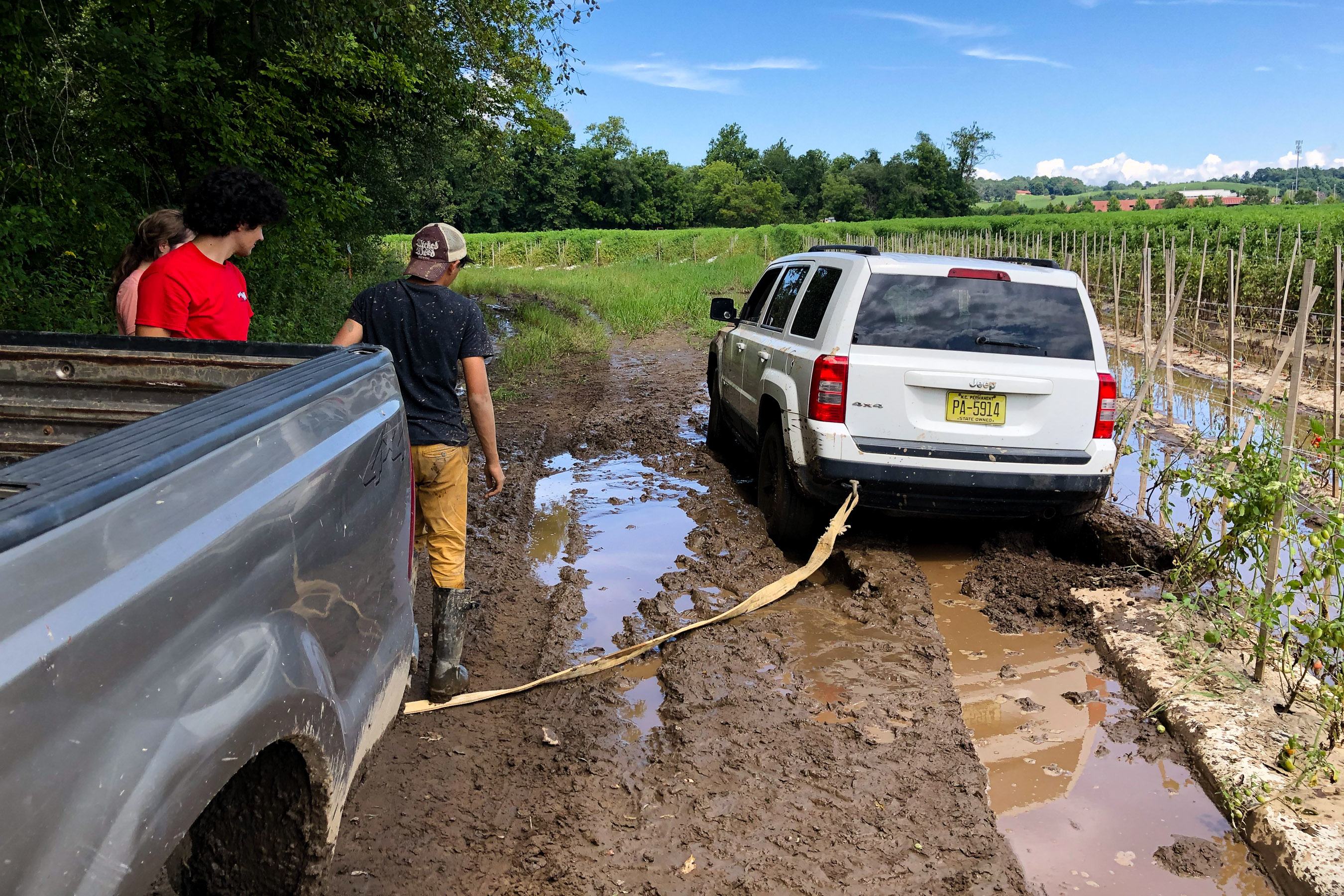 Checking brown marmorated stink bug trap beside a muddy tomato field, Henderson County, 2022