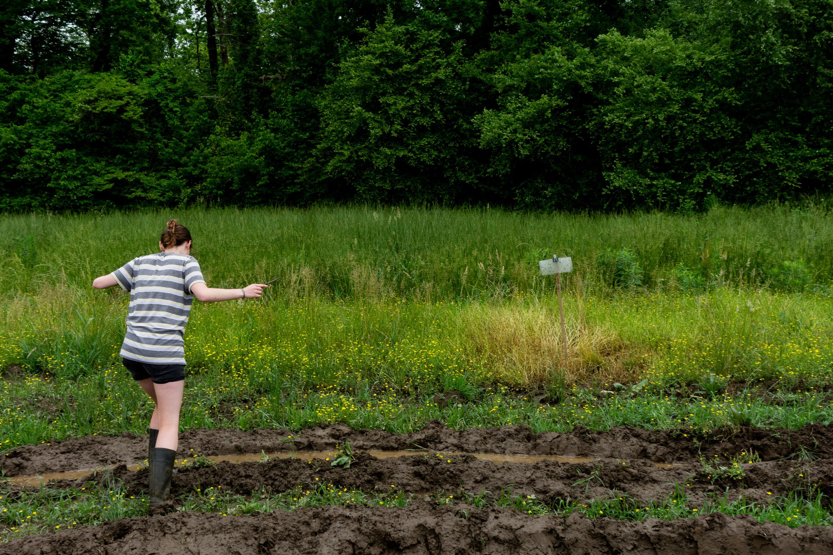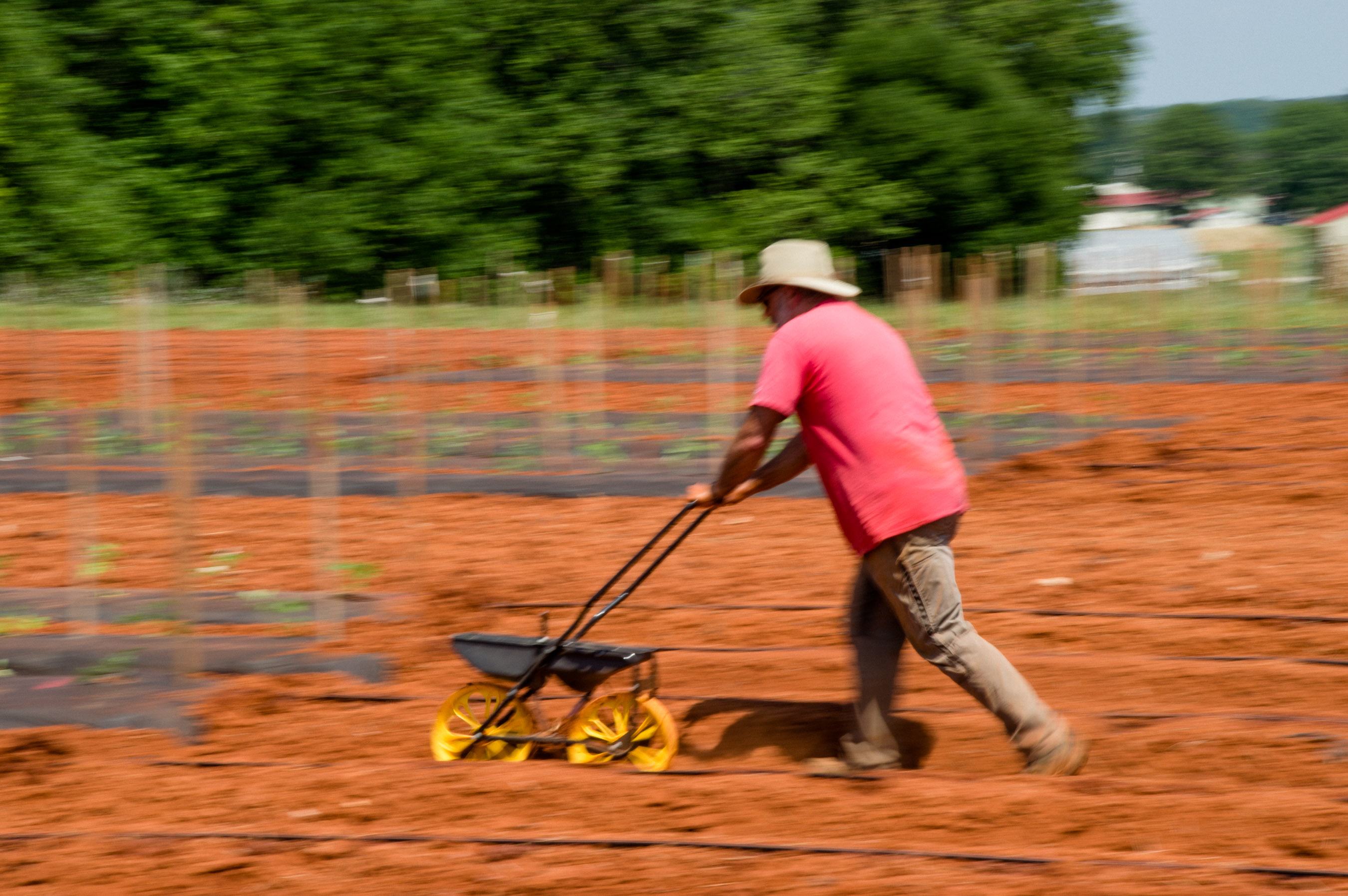 Seeding between rows of tomatoes for insecticide trial, Rowan County, 2018
