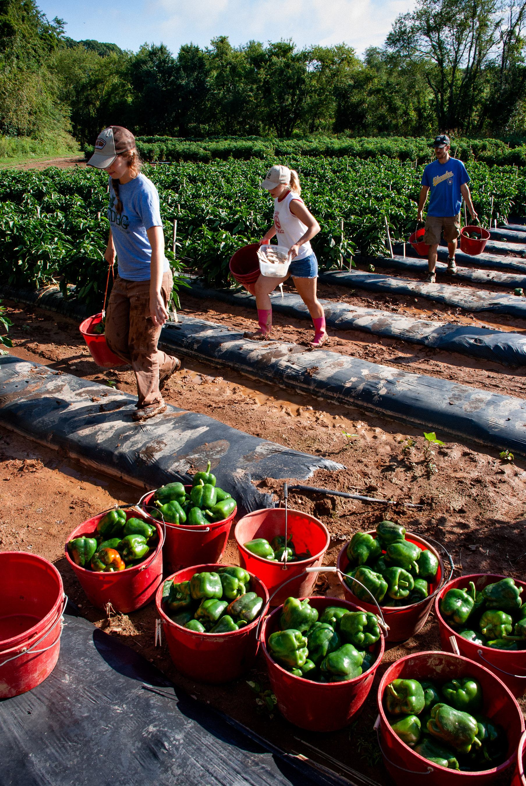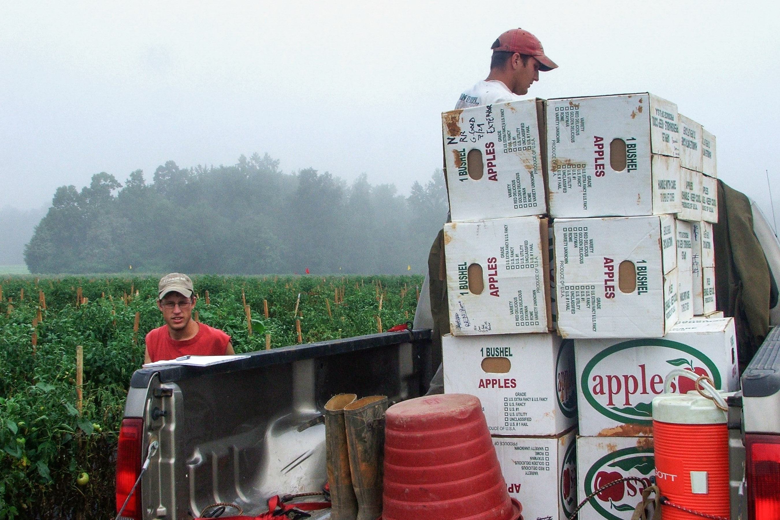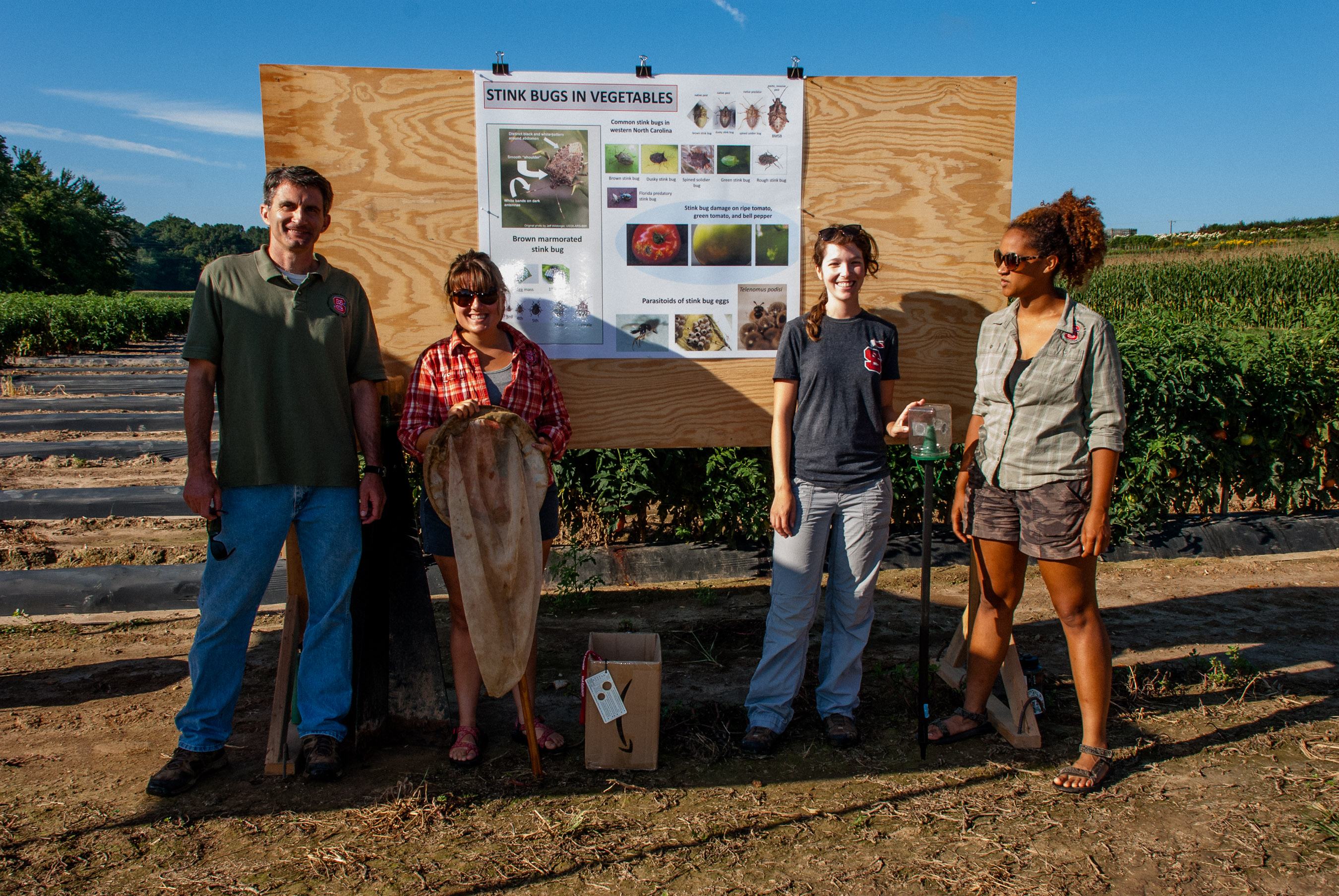 Scouting for stink bugs on an organic farm, Buncombe County, 2015