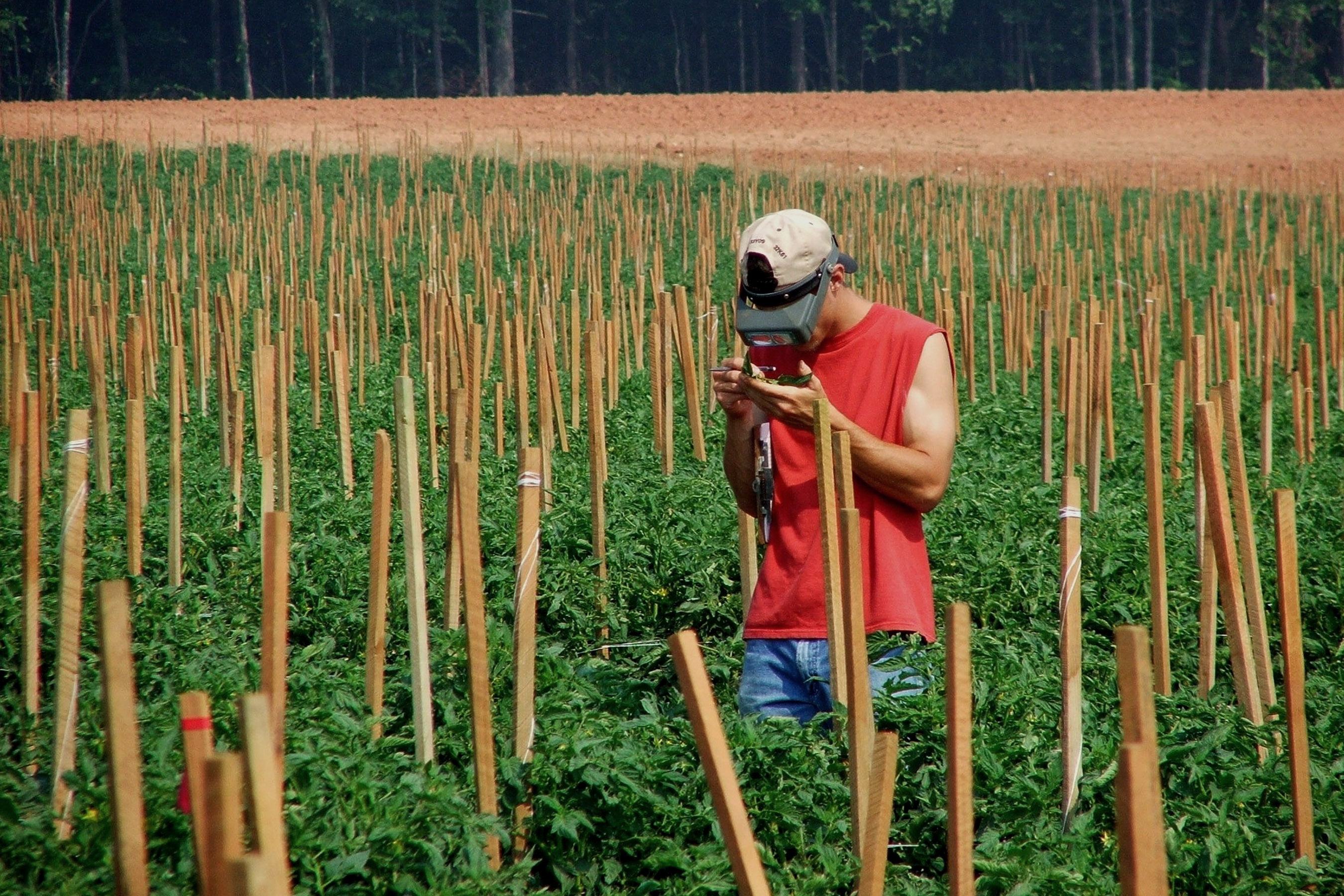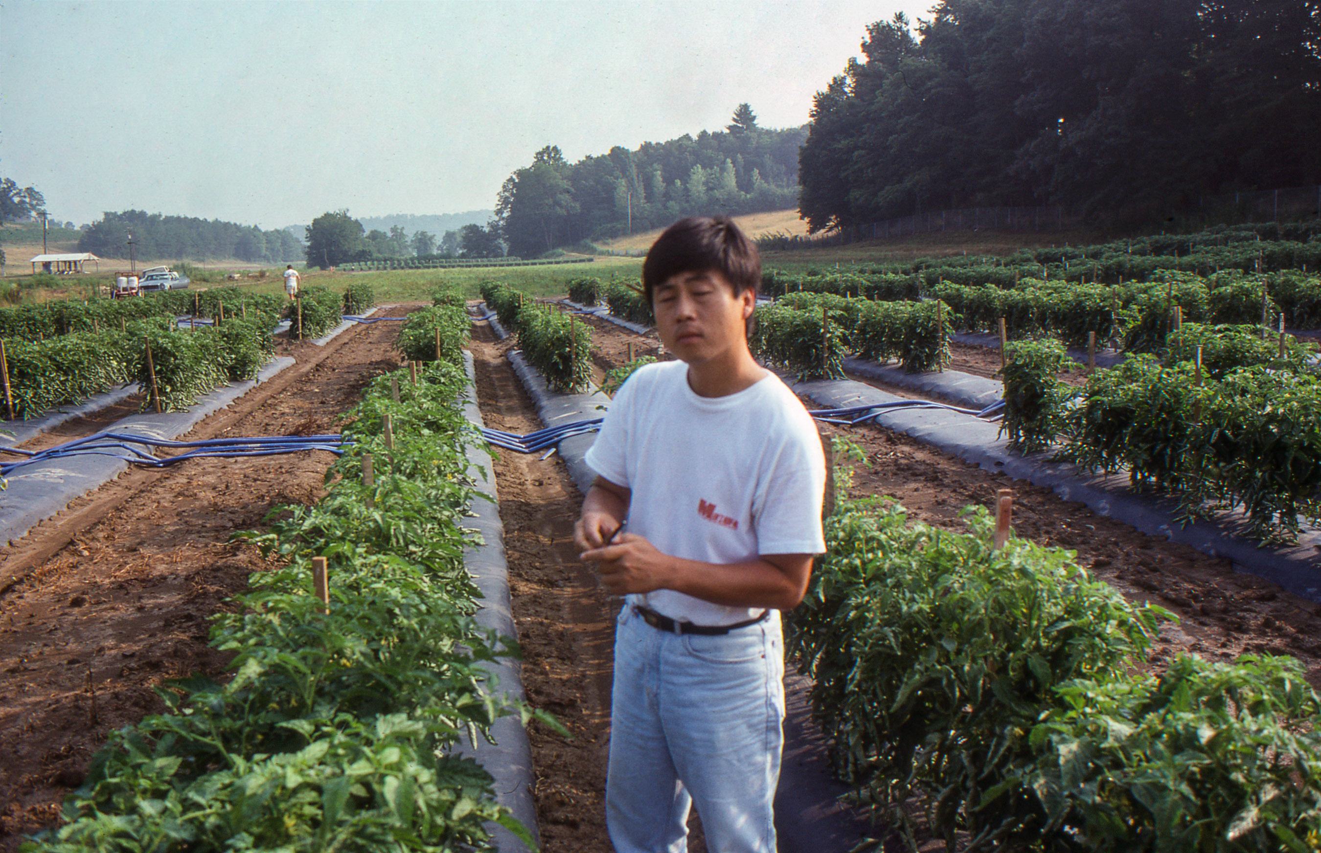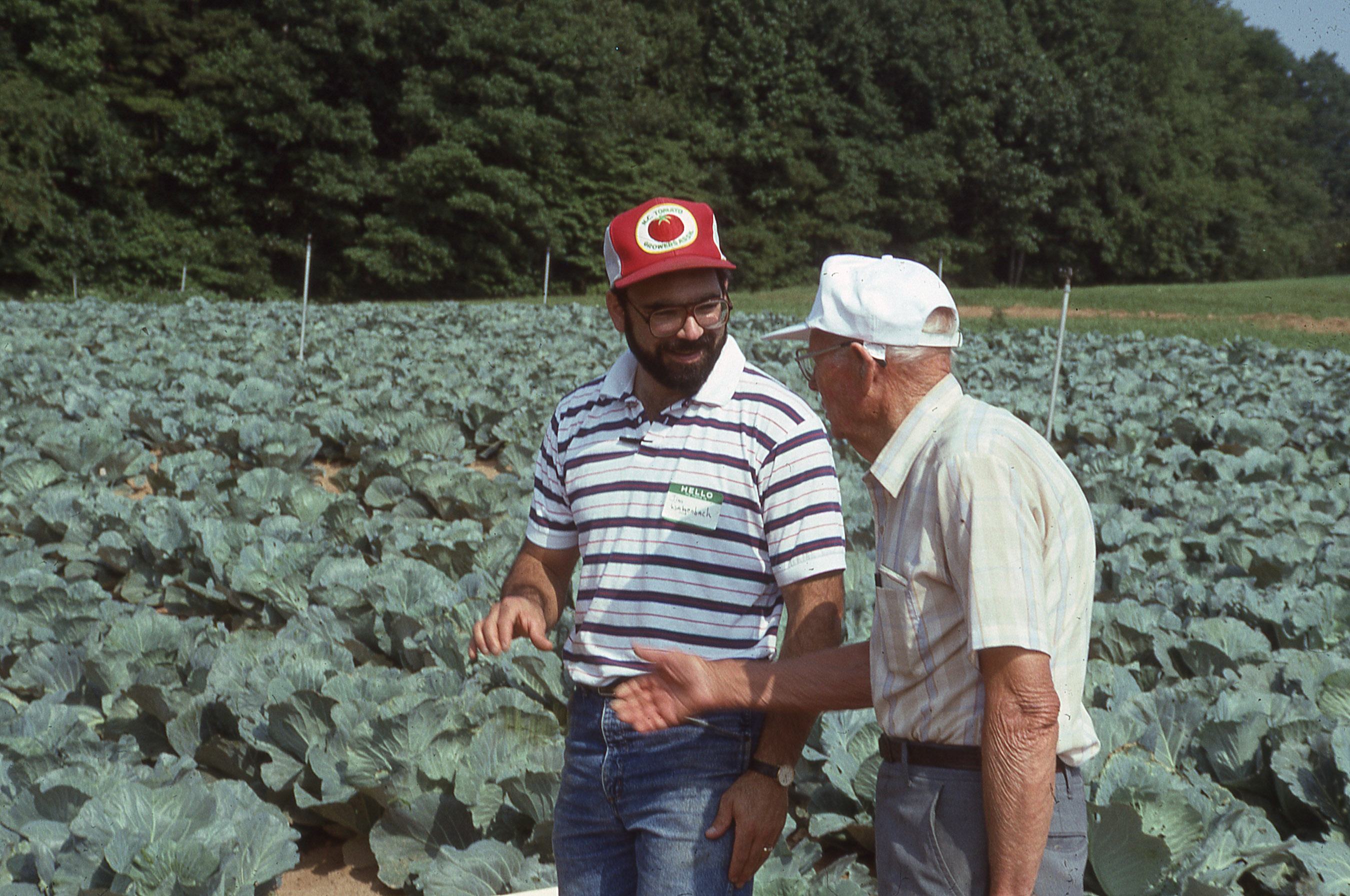 Scouting twospotted spider mites in tomato field, Rowan County, c. 2005