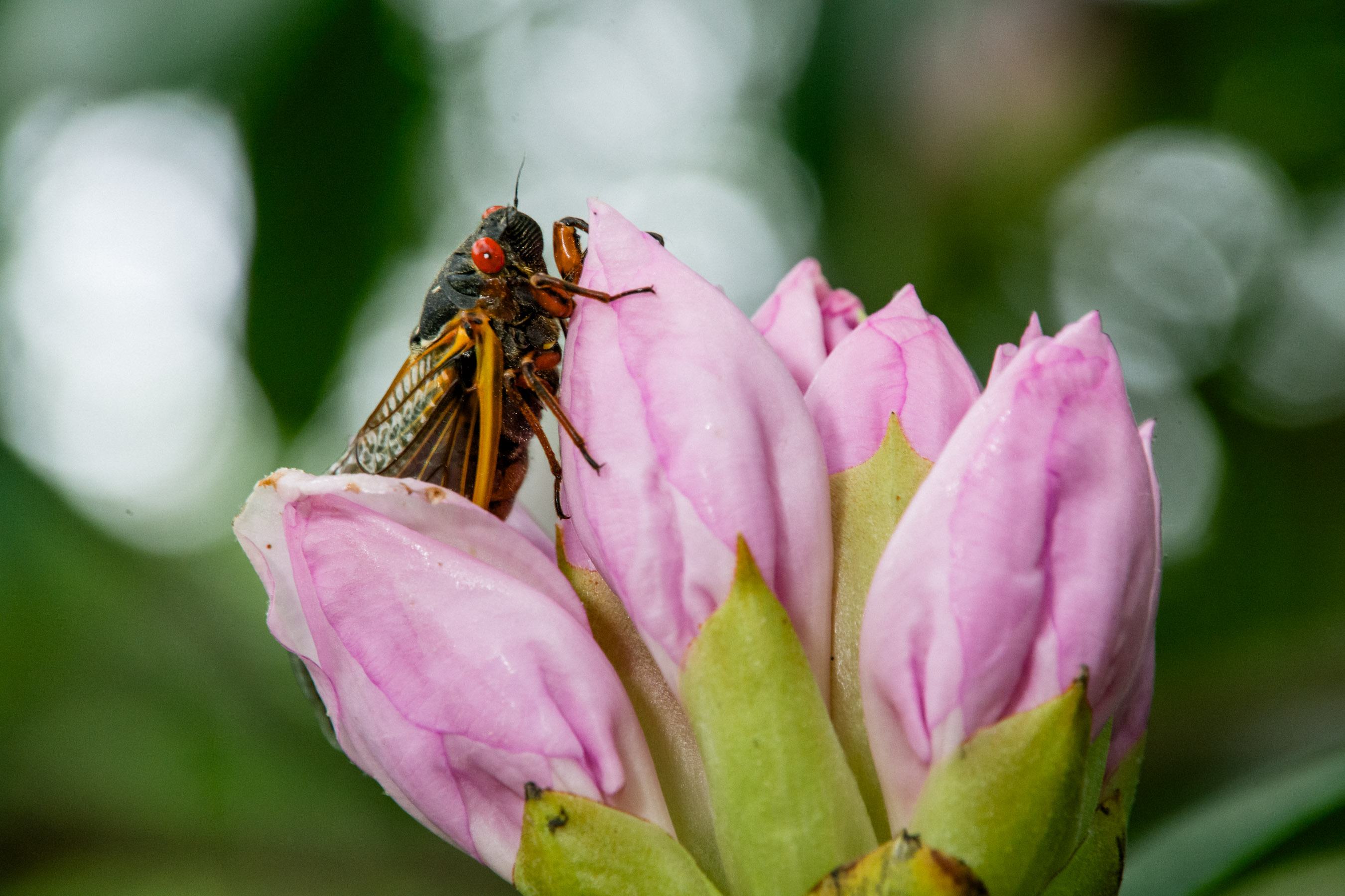 Periodical cicada on rhododendron flower, Brood XIV, Buncombe County, 2025