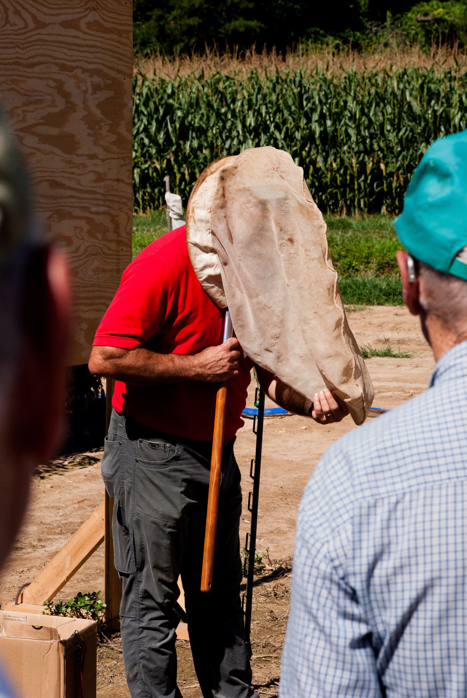Transferring bees from net to jar, pollinator study, Henderson County, 2022